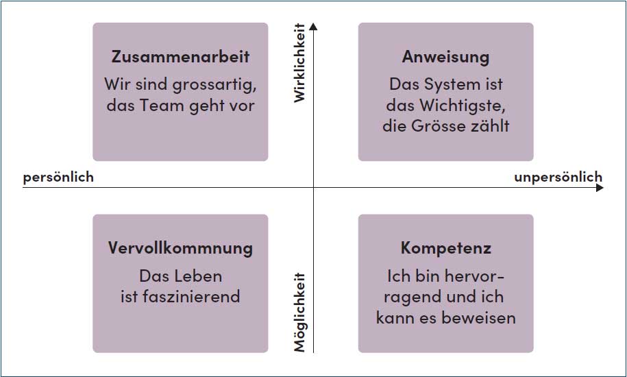 Nach William Schneider bildet eine Organisation in der Regel eine dieser Kern kulturen aus (siehe Abbildung 1). Er bietet in seinem Buch auch einen Fragebogen mit 20 Fragen an, mit dem herausgefunden werden kann, welche Kernkultur in der Organisation vorherrscht.