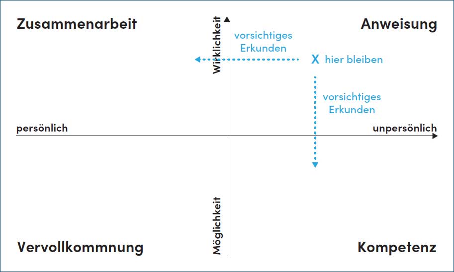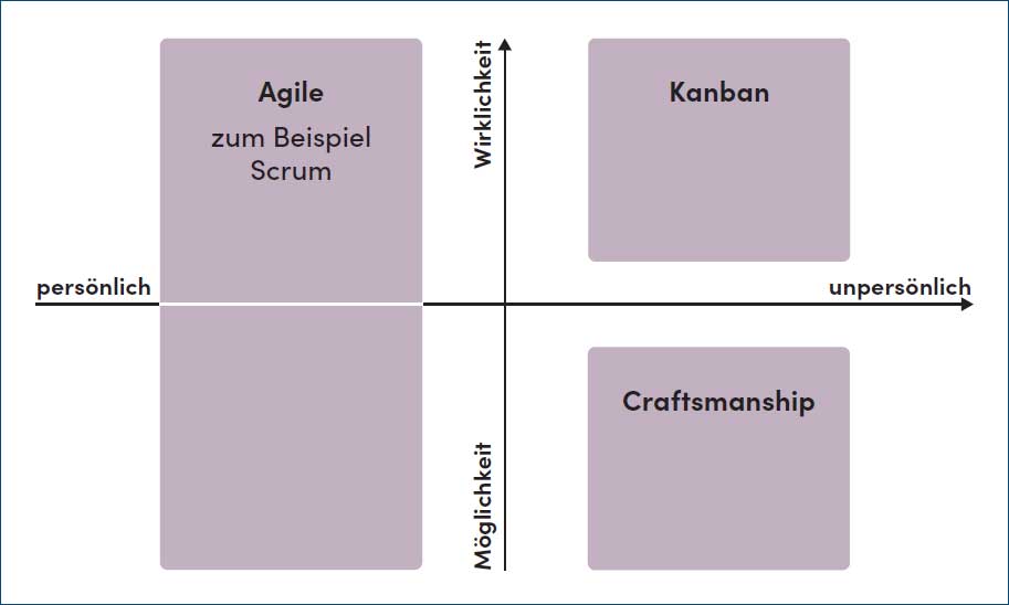 Kulturen, die sich diagonal gegenüberliegen, sind gegensätzlich. Eine organisatorische Veränderung von einem Quadranten zum diagonal gegenüberliegenden ist die größte Herausforderung. Einfacher sind Veränderungen hin zu einem Nachbarn. Scrum z.B. kann in einer Kultur der Kontrolle in aller Regel nicht gedeihen und nicht die erhofften Vorteile bringen (siehe Abbildung 4).