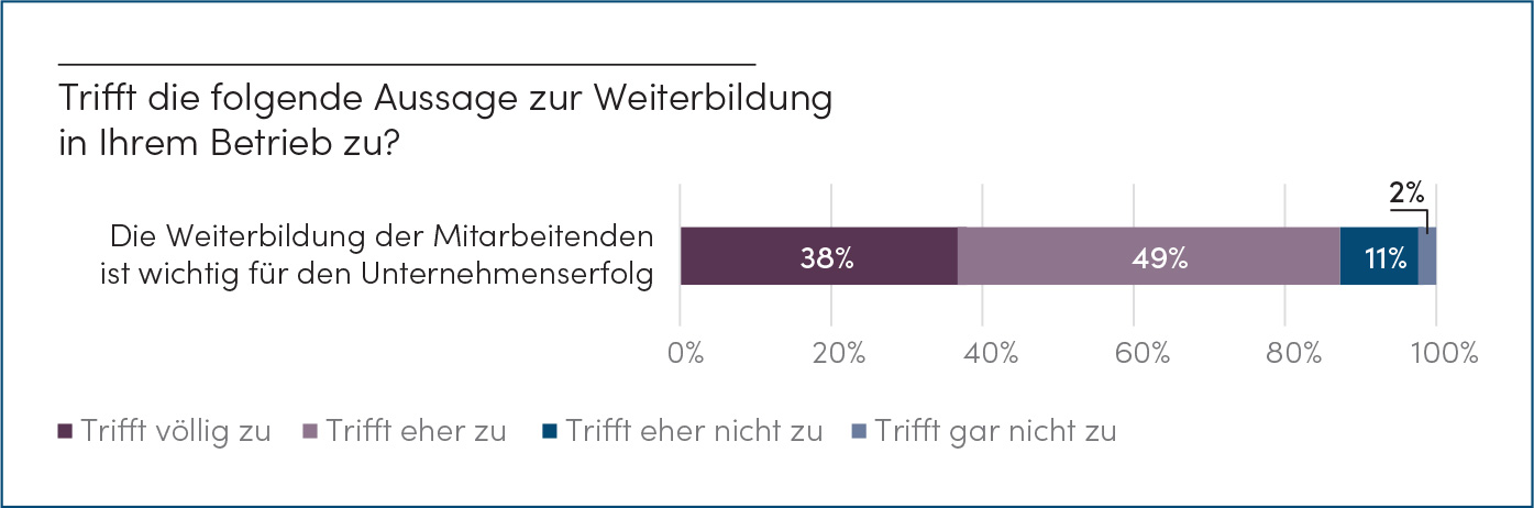 Die Relevanz von Weiterbildung ist weitgehend unbestritten: Die grosse Mehrheit der Schweizer Mikro- und Kleinbetriebe schreibt der Weiterbildung eine grosse Bedeutung zu. Fast 90% erachten sie als wichtig für den Unternehmenserfolg (siehe Abbildung 1). Sie ist bei einer Mehrheit Bestandteil des Unternehmensbudgets und der Unternehmensstrategie. Viele Betriebe nehmen ihre Mitarbeitenden als weiterbildungsmotiviert wahr und unterstützen sie finanziell oder stellen Arbeitszeit für die Weiterbildung zur Verfügung.
