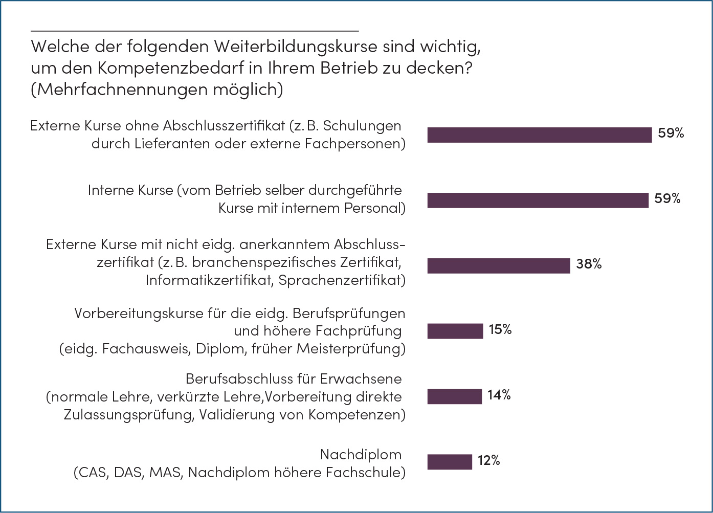 Ein Grund ist die klare Präferenz für kurze, praxisorientierte Kursformate. Im Bereich der nonformalen Bildung lassen sich verschiedene Typen von Kursen unterscheiden (siehe Abbildung 2). Als relevant erachten die KMU vor allem externe Kurse ohne Abschlusszertifikat und interne Kurse, da diese eher auf die Bedürfnisse der Betriebe zugeschnitten sind. Gemäss den Befragten sind die anfallenden Kosten für externe Kurse grösser als bei niederschwelligen, kurzfristig organisierbaren und praxisorientierten Schulungen. Bei internen Schulungen ist für KMU der Zeitaufwand, aber auch das Risiko einer Fehlinvestition geringer.