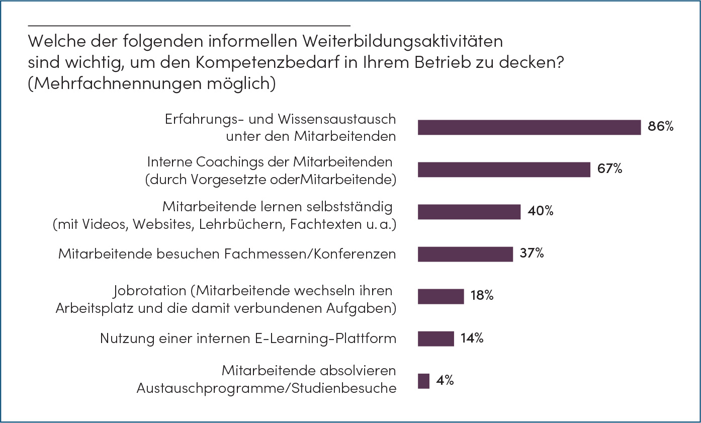 Ein weiterer Grund für die Diskrepanz zwischen der hohen Relevanz und der eher tiefen Weiterbildungsaktivität ist der Weiterbildungsbegriff in den Betrieben. Zu Weiterbildung gehört neben den Kurssettings auch das informelle Lernen. Es umfasst das Lernen ausserhalb von Kursstrukturen, also beispielsweise «learning on the job», verfolgt jedoch ebenfalls klare Lernziele und sollte zu einem gewissen Grad strukturiert erfolgen. Die Umfrage hat gezeigt, dass viele KMU eher einen engen Weiterbildungsbegriff aufweisen. Sie verstehen unter Weiterbildung primär Kurssettings und sehen ihre informellen Weiterbildungsaktivitäten nicht als eigentliche Weiterbildung. Werden sie jedoch direkt nach der Bedeutung verschiedener Typen von informeller Weiterbildung gefragt, so zeigt sich, dass viele Betriebe diese als höchst relevant erachten (siehe Abbildung 3). KMU stufen insbesondere informelle Weiterbildungstypen, die auf persönlichem Austausch innerhalb des Teams beruhen, als wichtig ein. 86% der KMU geben an, dass der Erfahrungs- und Wissensaustausch zwischen den Mitarbeitenden eine zentrale Rolle spiele, und fast zwei Drittel der KMU beurteilen interne Coachings als wichtige Massnahme. Weitere informelle Weiterbildungstypen wie das selbstständige Lernen der Mitarbeitenden oder der Besuch von Fachmessen/Konferenzen werden von den KMU seltener als wichtig eingeschätzt.